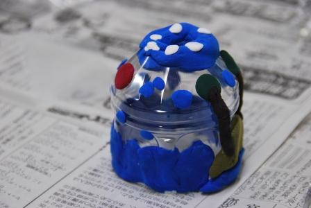 着色した粘土を好きな形にし、ペットボトルに貼り付けているところです。