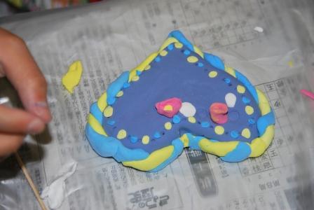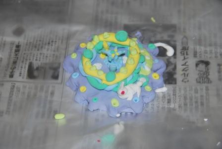 そして、色の付いた粘土で土台となる部分をつくり、そこに「まるめる」「ねじる」「細くする」「和をつくる」「尖らせる」などして動きをつけた粘土で装飾したり、楊枝などで土台部分に直接模様を描いたりと、皆手が動くままに作品を創っていきました。