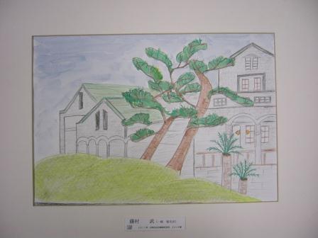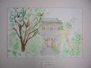 ロマネスク風のアーチや階段、レンガの壁面などが緻密に描かれた作品。軽く描いた周囲の緑との対比で別荘の細かな意匠がより伝わってきます。