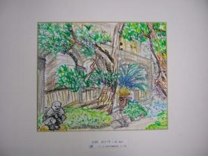 この不思議な彫刻を唯一構図に含んで描いた作品。柔らかいクレヨンのタッチで銅像にも愛嬌が感じられます。