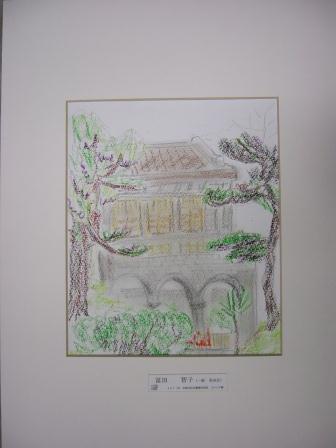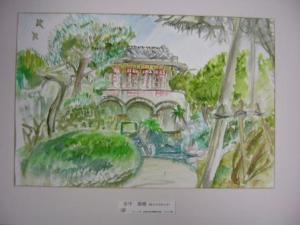 大胆なタッチで古建築と庭の雰囲気をいきいき描いています。