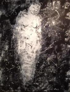 西方麻子さんによる油彩画の個展で、女性の身体を白と黒を基調に抽象的に描いた「在るシリーズ」を中心に展示されました。今回はその中の一点を紹介します。