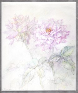 豊田さんは過去のギャラリー・いなげ企画展「Chiba Art Flash2001」の参加作家のお一人で、日本画と立体の境界にあるような作品を制作されています。今回は、豊田さんが目の病を患っていた一時期に描いた草花のスケッチを展示していました。上の作品は、花が完全に開き散る直前の野ばらを描いています。2本のバラが見えますが、これは一本のバラを違う角度から描いているそうです。色彩があっさりしているのとは対照的に線は非常に緻密です。この野ばらを「今」しっかりと見ておきたいという思いが感じられる作品でした。