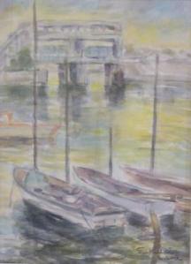 船橋にある海老川を水彩で描いた作品で、手前にはボート、奥には海老川の水門が見えます。