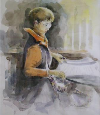 堀本家にとってはごく日常の風景だと思いますが、奥様の静かで真剣なまなざしが淡く少し暗めの色でよく表現されており、生活感をあまり感じさせない落ち着いた作品になっていました。