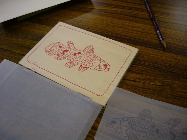 下絵が決まったらカーボン紙を使って版木に写します。どんな作品に仕上がるのか?