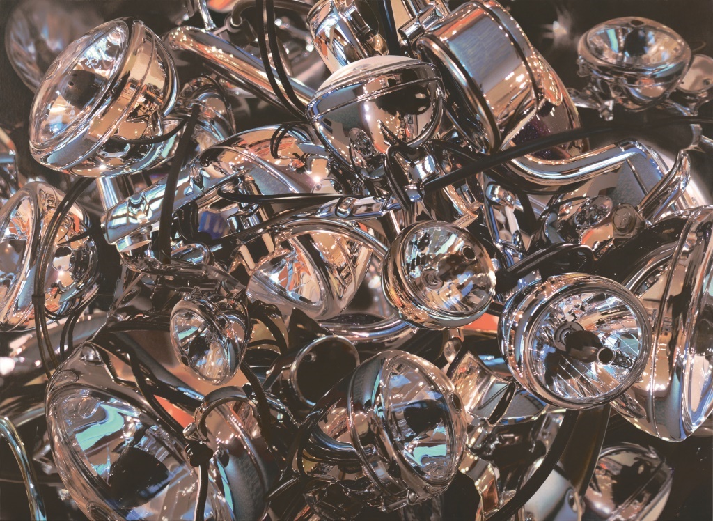 金属の輝きや反射を通した世界を卓越した油彩の技術で表現しています。