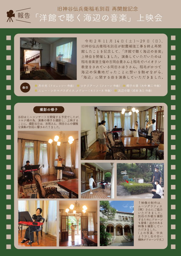 【報告】旧神谷伝兵衛稲毛別荘再開館記念「洋館で聴く海辺の音楽」上映会 投稿日: 2021年1月24日 投稿者: 千葉市民ギャラリー・いなげ カテゴリー: 活動報告 共有: クリックして X で共有 (新しいウィンドウで開きます) X Facebook で共有するにはクリックしてください (新しいウィンドウで開きます) Facebook クリックして LinkedIn で共有 (新しいウィンドウで開きます) LinkedIn クリックして Tumblr で共有 (新しいウィンドウで開きます) Tumblr クリックして Pinterest で共有 (新しいウィンドウで開きます) Pinterest クリックして友達にメールでリンクを送信 (新しいウィンドウで開きます) メールアドレス いいね 読み込み中… 関連