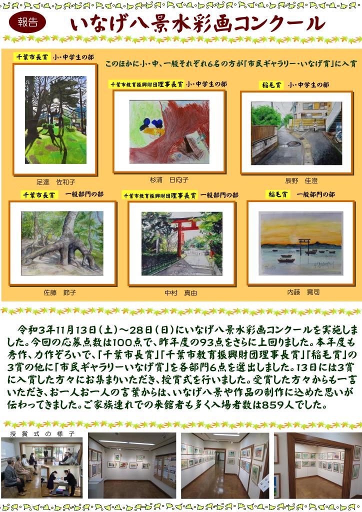 【報告】第5回いなげ八景水彩画コンクール 投稿日: 2021年12月8日 投稿者: 千葉市民ギャラリー・いなげ カテゴリー: 活動報告 共有: クリックして X で共有 (新しいウィンドウで開きます) X Facebook で共有するにはクリックしてください (新しいウィンドウで開きます) Facebook クリックして LinkedIn で共有 (新しいウィンドウで開きます) LinkedIn クリックして Tumblr で共有 (新しいウィンドウで開きます) Tumblr クリックして Pinterest で共有 (新しいウィンドウで開きます) Pinterest クリックして友達にメールでリンクを送信 (新しいウィンドウで開きます) メールアドレス いいね 読み込み中… 関連
