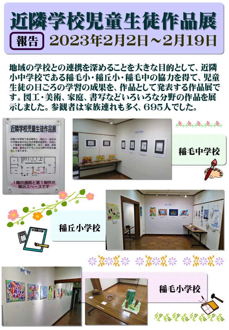 【報告】 近隣学校児童生徒作品展 2023 投稿日: 2023年3月25日 投稿者: 千葉市民ギャラリー・いなげ カテゴリー: 活動報告 共有: クリックして X で共有 (新しいウィンドウで開きます) X Facebook で共有するにはクリックしてください (新しいウィンドウで開きます) Facebook クリックして LinkedIn で共有 (新しいウィンドウで開きます) LinkedIn クリックして Tumblr で共有 (新しいウィンドウで開きます) Tumblr クリックして Pinterest で共有 (新しいウィンドウで開きます) Pinterest クリックして友達にメールでリンクを送信 (新しいウィンドウで開きます) メールアドレス いいね 読み込み中… 関連