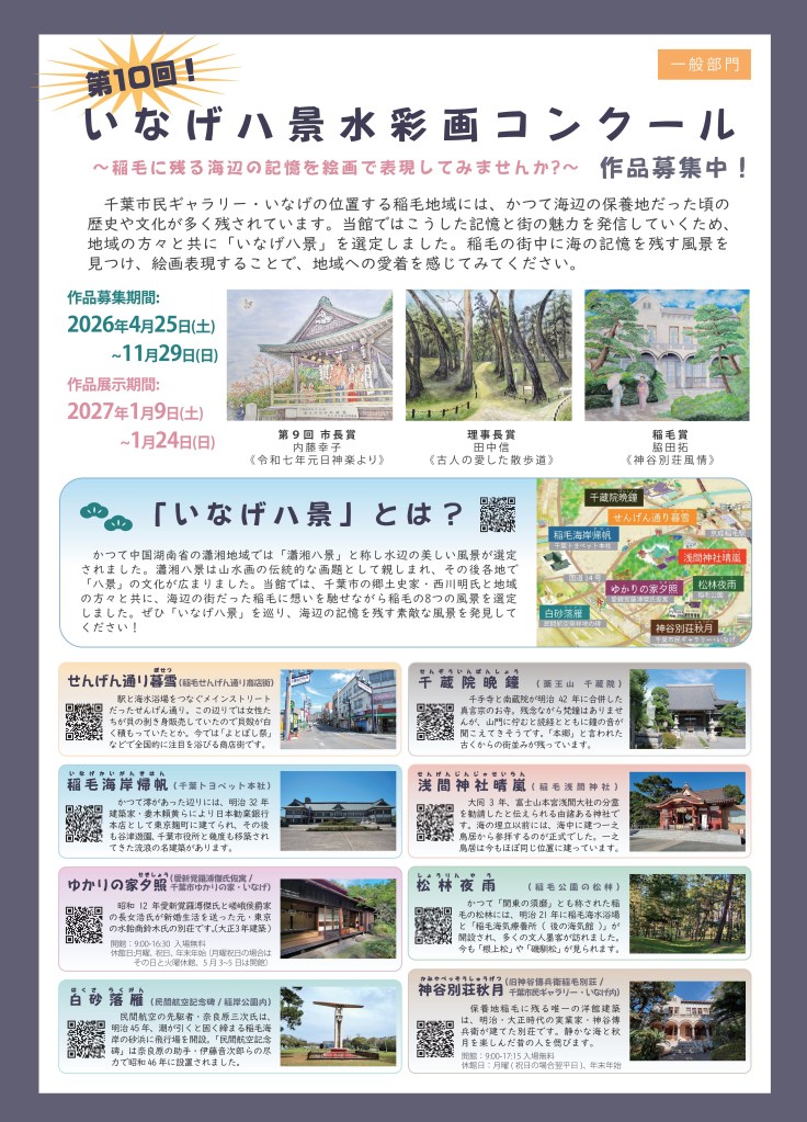 千葉市民ギャラリー・いなげの位置する稲毛地域には、かつて海辺の保養地だった頃の歴史や文化が多く残されています。当館ではこうした記憶と街の魅力を発信していくため、地域の方々と共に「いなげ八景」を選定しました。