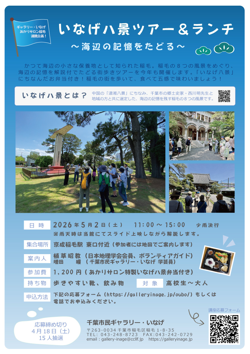 千葉都市文化賞2017で景観まちづくり部門優秀賞を受賞した「いなげ八景」を巡るツアーです。ボランティアガイドの植草昭教さん(日本地理学会会員)とギャラリー学芸員と一緒に、かつての海辺の記憶を物語る稲毛の風景を巡ります。あかりサロン特製「いなげ八景弁当」付きです!