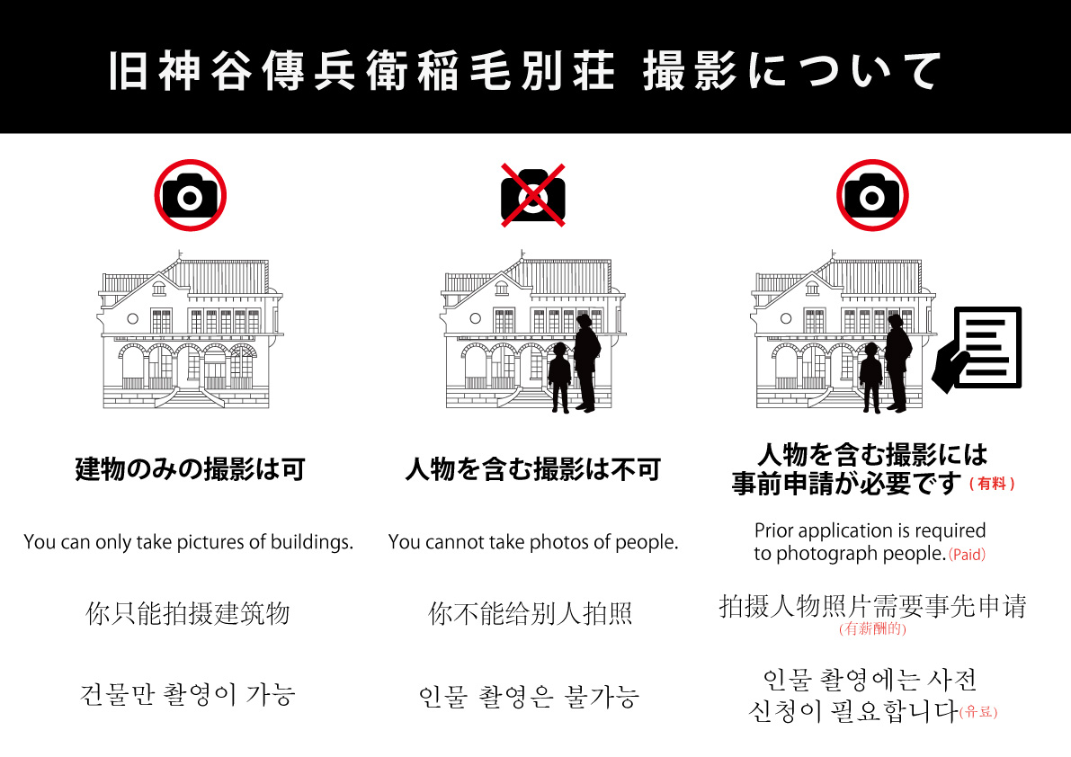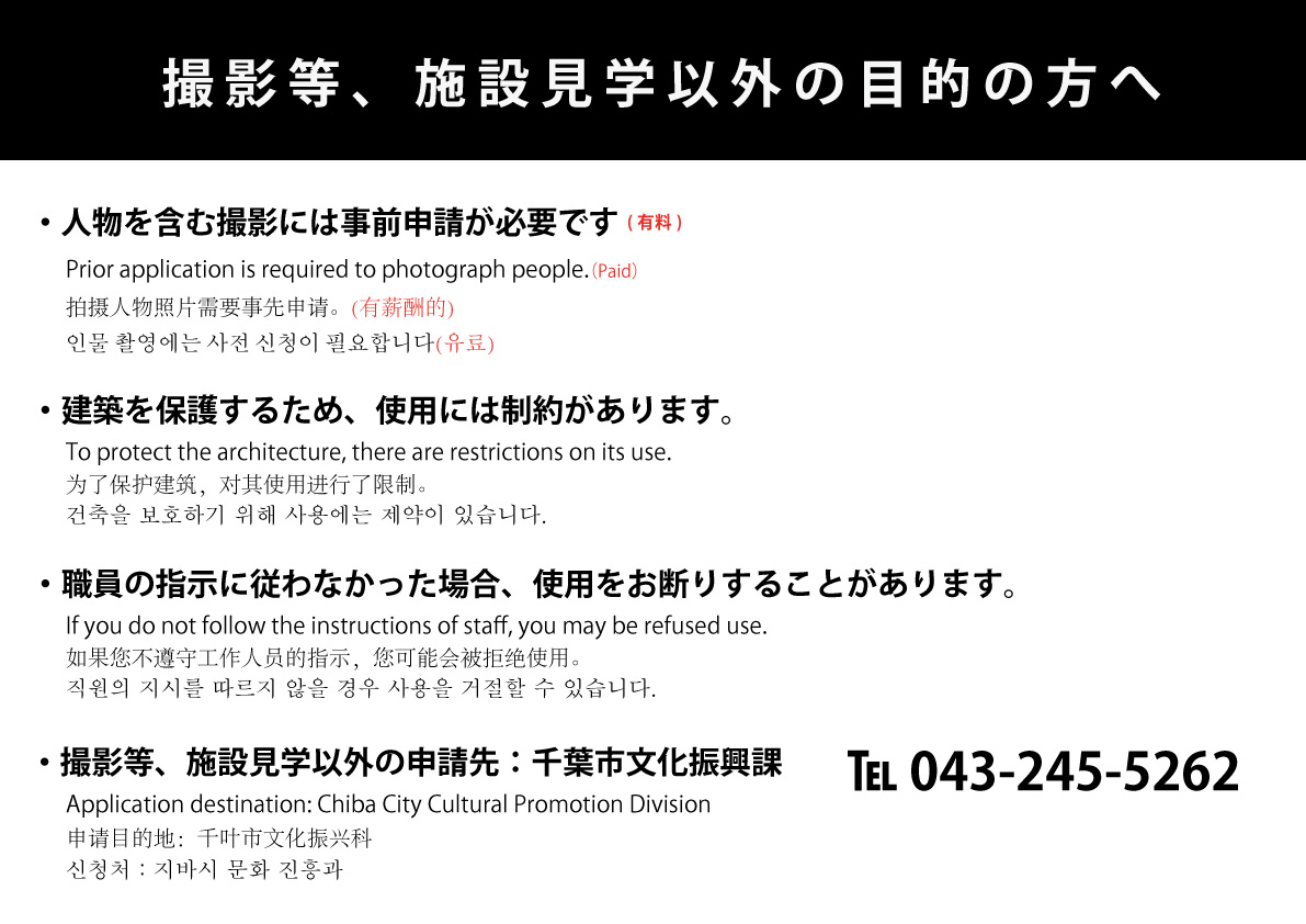 旧神谷傳兵衛稲毛別荘での施設見学以外(撮影等)の目的で使用を希望される方は、希望日の3週間前までに千葉市文化振興課へご連絡をお願いいたします。(3カ月前より受付開始)