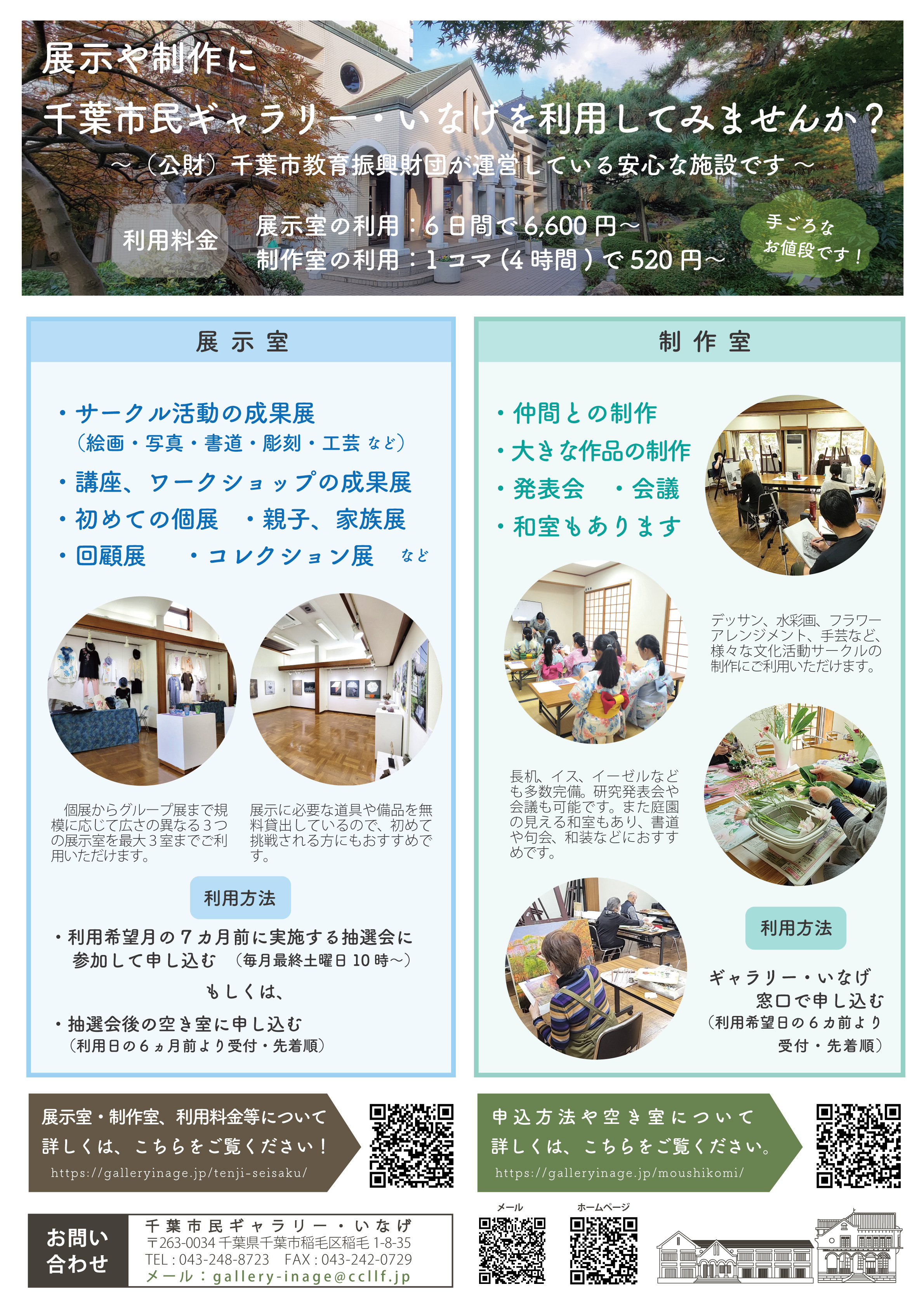 | 1.利用は原則として千葉市在住・在勤・在学の人、およびそれらの人で構成されている団体です。 2.展示室は個展にも利用できますが、制作室はグループ利用となります。 3.展覧会の際は、主催者(主催団体)による展示品の管理・受付が原則となります。 4.営利を目的とする使用はできません。 5.すでに支払われた利用料金は原則返還いたしません。なお、施設を使用する日の3か月前(制作室にあっては1か月前)までに「使用取消届」を出された場合、支払われた利用料金の8割を返還いたします。 6.許可した内容を変更したい場合は、施設を使用する日の3か月前(制作室にあたっては1カ月前)までに変更の手続き「使用許可事項変更許可申請書」を提出して変更することが出来ます。 7.許可をした後に暴力団の利益となる使用であることが判明した場合は、許可を取消します。 →展示室利用にあたっての詳細はこちら |