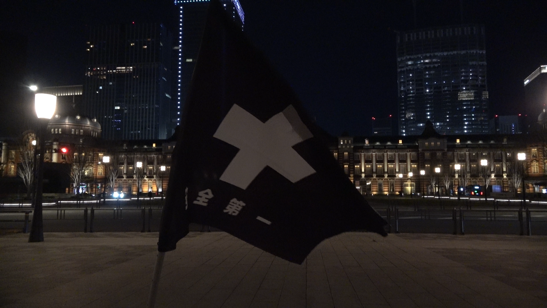 建設現場に掲げられる安全旗から着想を得た「SAFETY FIRST(2022)」は、「特定の期間に1日単位で機械的に制作を行った絵画作品群」、「オーダーメイドで製造された安全旗」、「旗を無人の東京駅前に掲げる映像」によって構成された作品です。先の見えずらい混沌に覆われた状況を、建設現場として捉え返す挑戦でもあるこの取り組みは、本来の旗の色彩をモノクロに変えることで、私たちを取り巻く環境への更なる想像を喚起し、安全や規範意識に満ちた都市空間に新たな自由の形を想像させます。